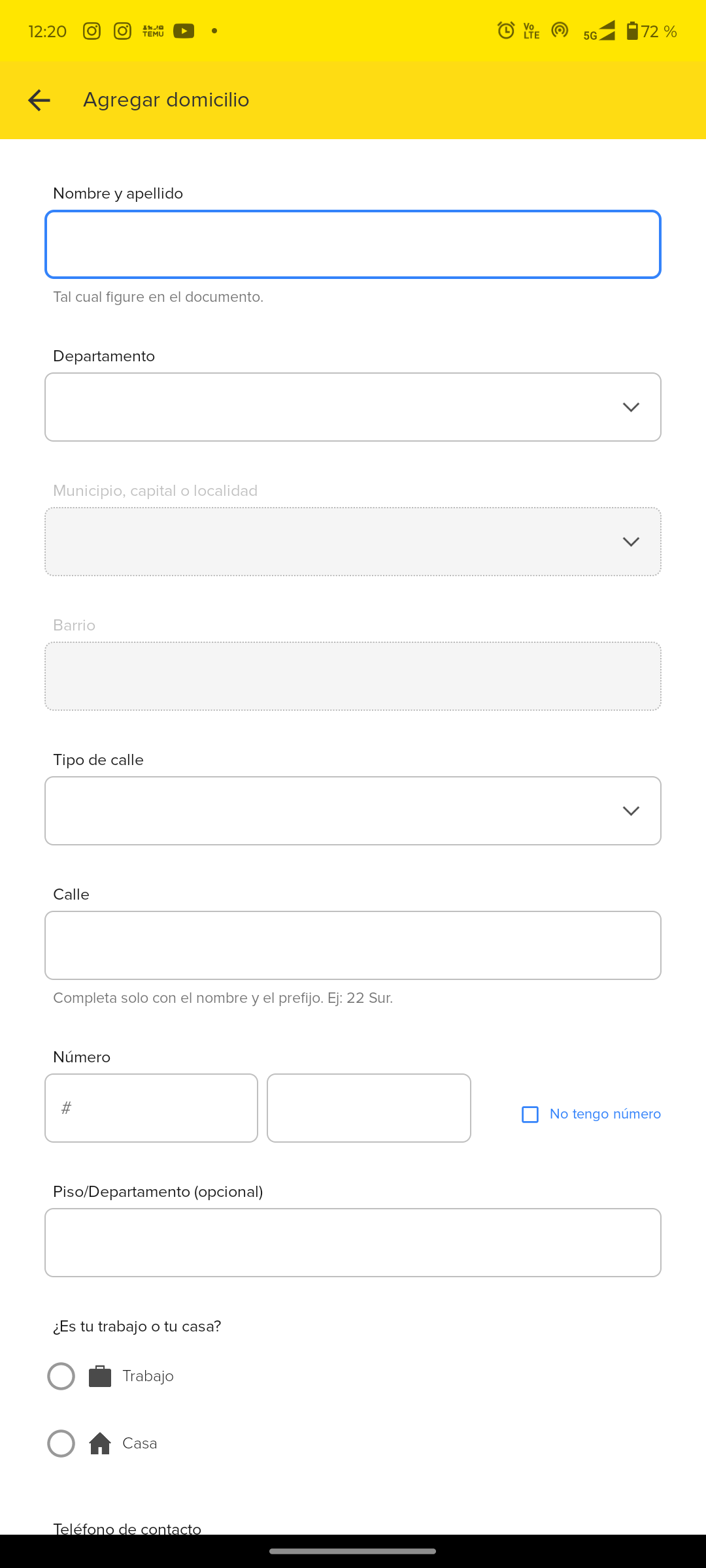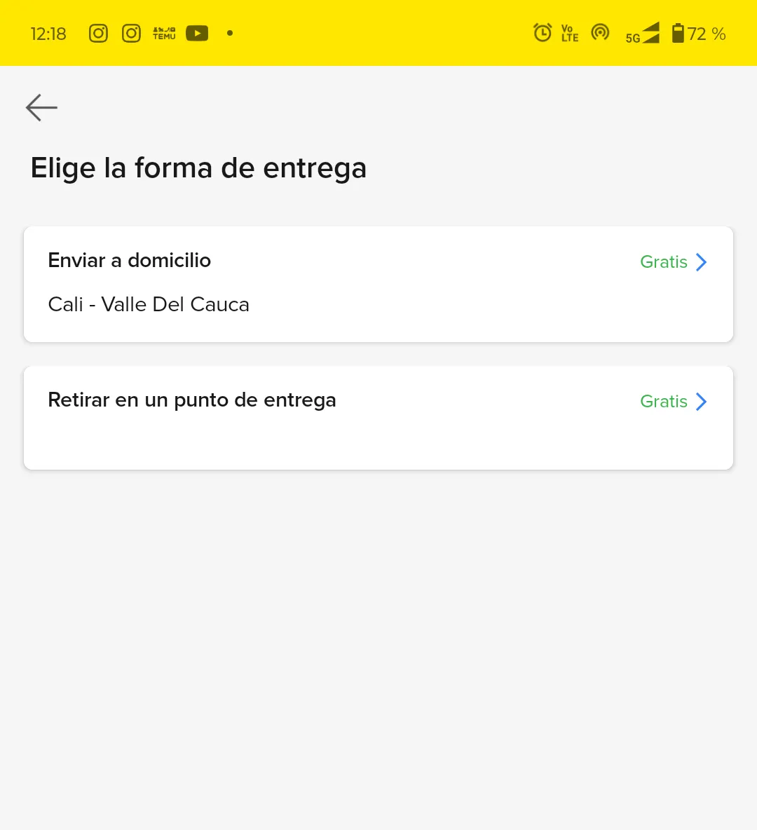 La app te pedirá que confirmes o elijas la dirección donde deseas recibir el producto. Puedes agregar una nueva dirección o seleccionar una de las guardadas.