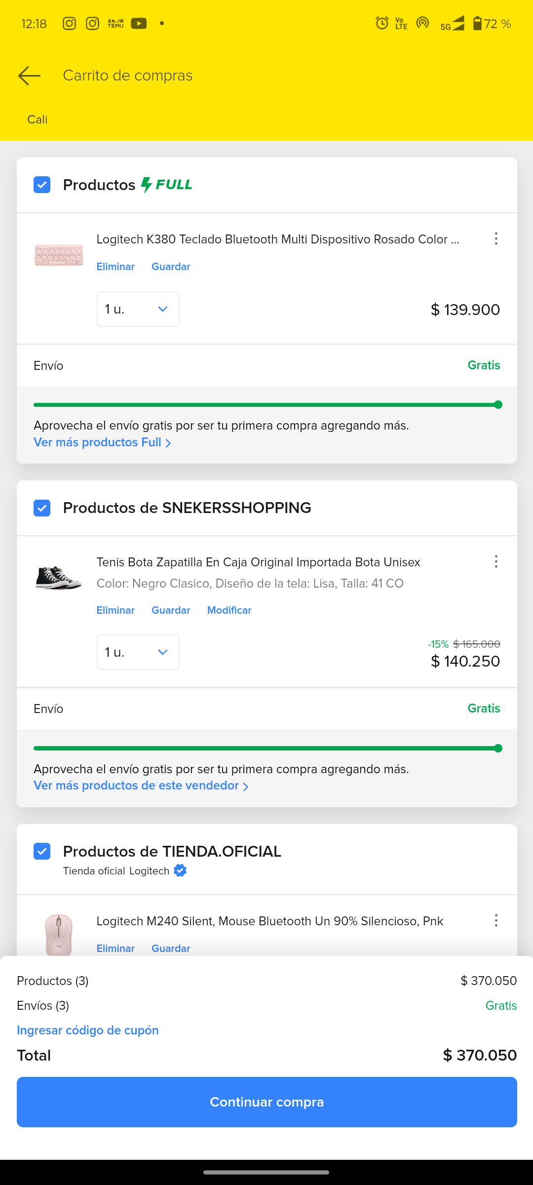 Si elegiste “Agregar al carrito”, dirígete a la sección del carrito (generalmente en la esquina superior derecha de la pantalla) para revisar los artículos que has seleccionado. Asegúrate de que todos los productos sean los correctos y, cuando estés listo, selecciona la opción “Continuar la compra”.