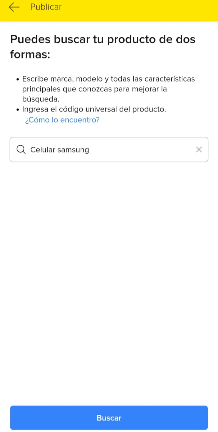 Para ayudarte a describir tu producto busca entre nuestras opciones cual es el que mas se asemeja al tuyo, en este caso vamos a vender un celular samsung, asi que lo ponemos en la barra de busqueda.